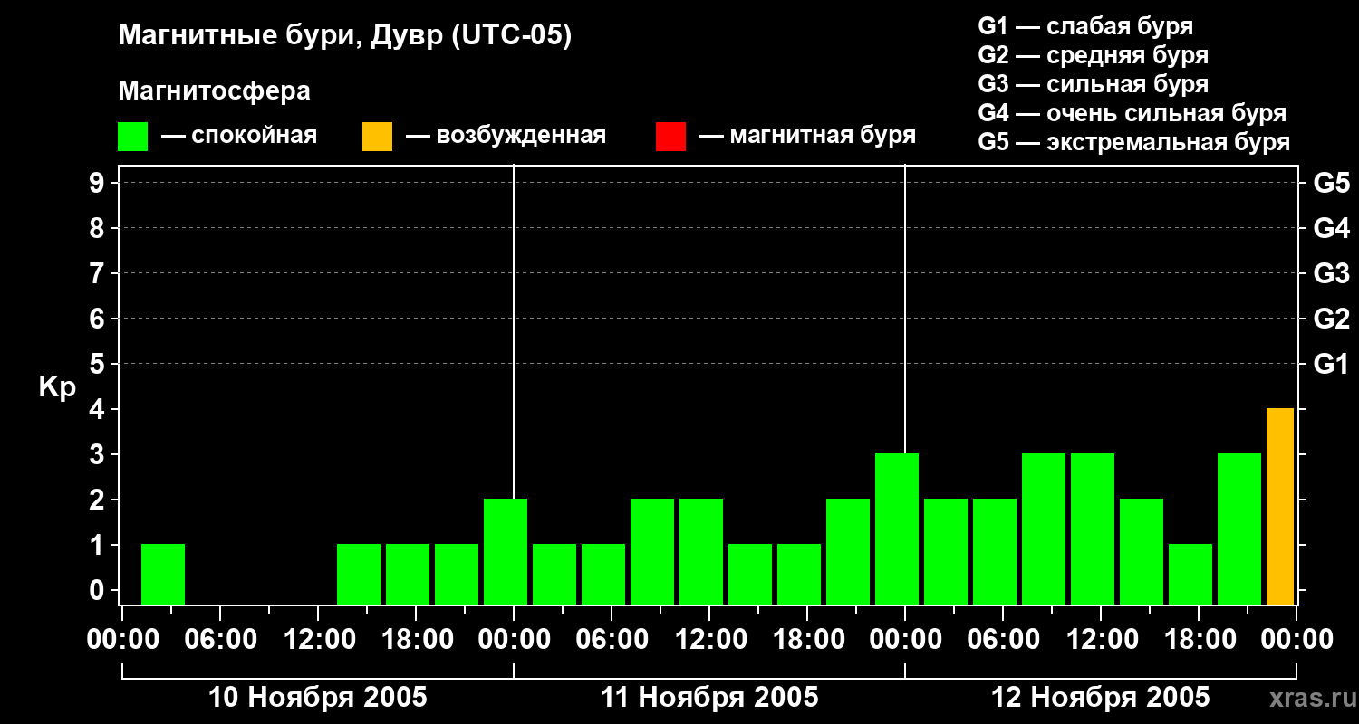 Изменения геомагнитного индекса Kp с 10 по 12 ноября 2005 года для средних широт