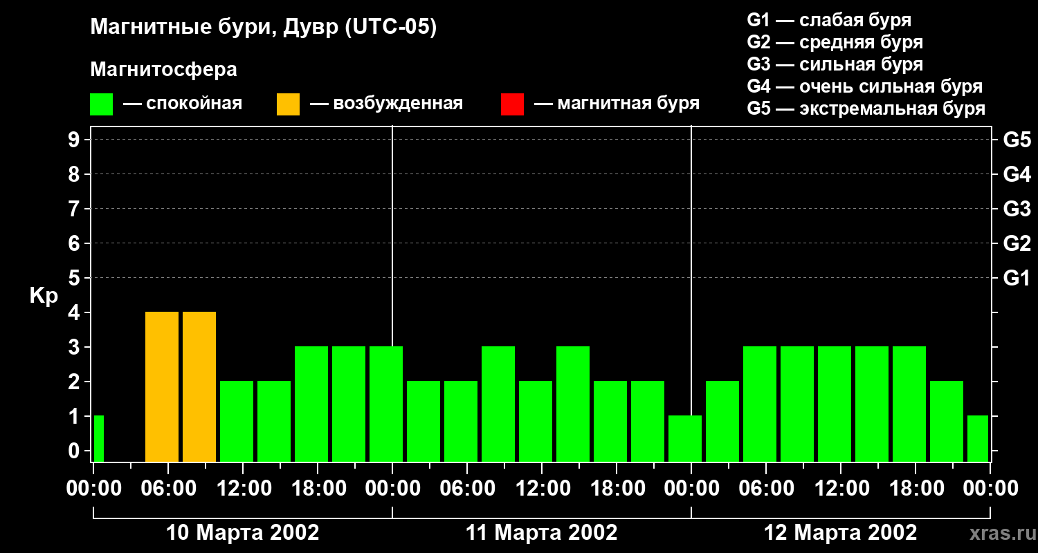 Изменения геомагнитного индекса Kp с 10 по 12 марта 2002 года для средних широт