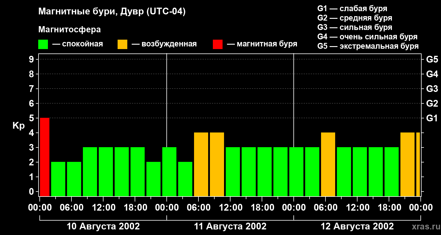 Изменения геомагнитного индекса Kp с 10 по 12 августа 2002 года для средних широт