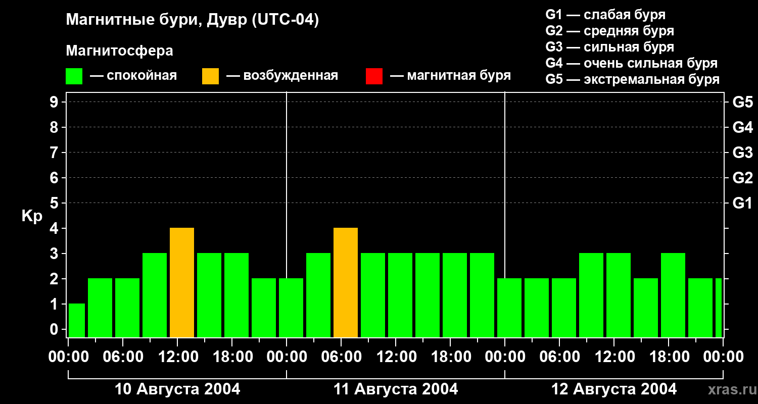 Изменения геомагнитного индекса Kp с 10 по 12 августа 2004 года для средних широт