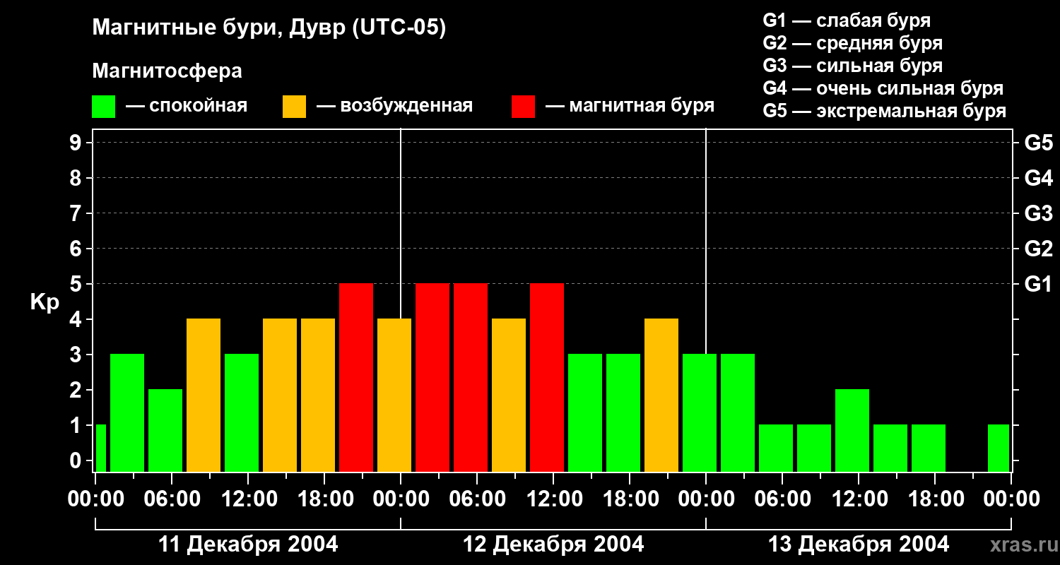 Изменения геомагнитного индекса Kp с 11 по 13 декабря 2004 года для средних широт