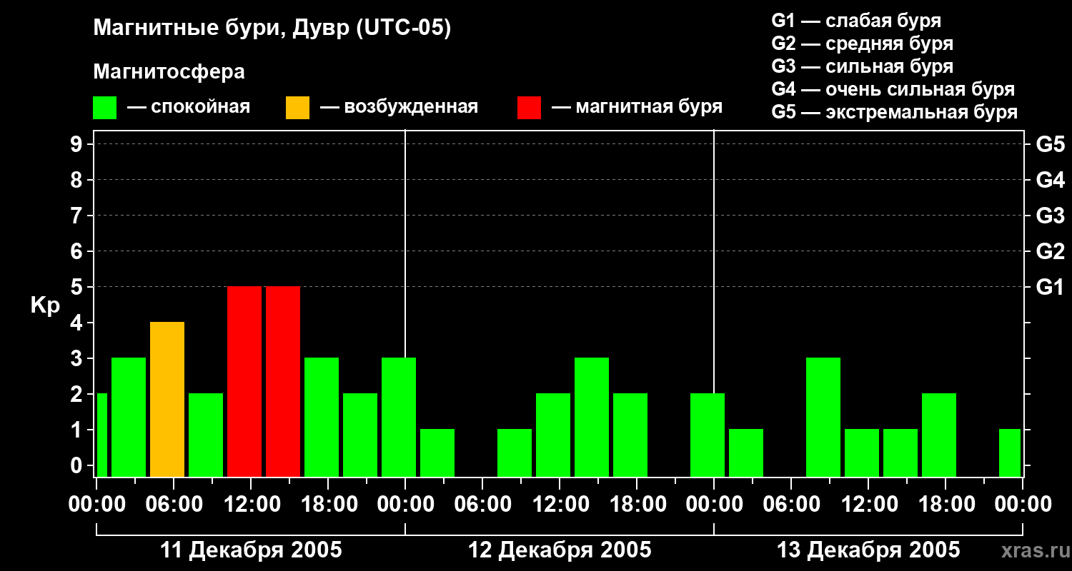Изменения геомагнитного индекса Kp с 11 по 13 декабря 2005 года для средних широт