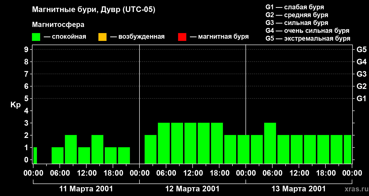 Изменения геомагнитного индекса Kp с 11 по 13 марта 2001 года для средних широт