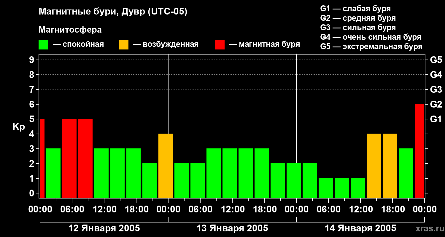Изменения геомагнитного индекса Kp с 12 по 14 января 2005 года для средних широт