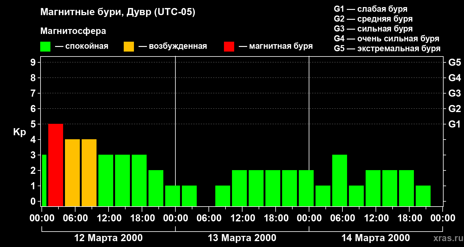 Изменения геомагнитного индекса Kp с 12 по 14 марта 2000 года для средних широт