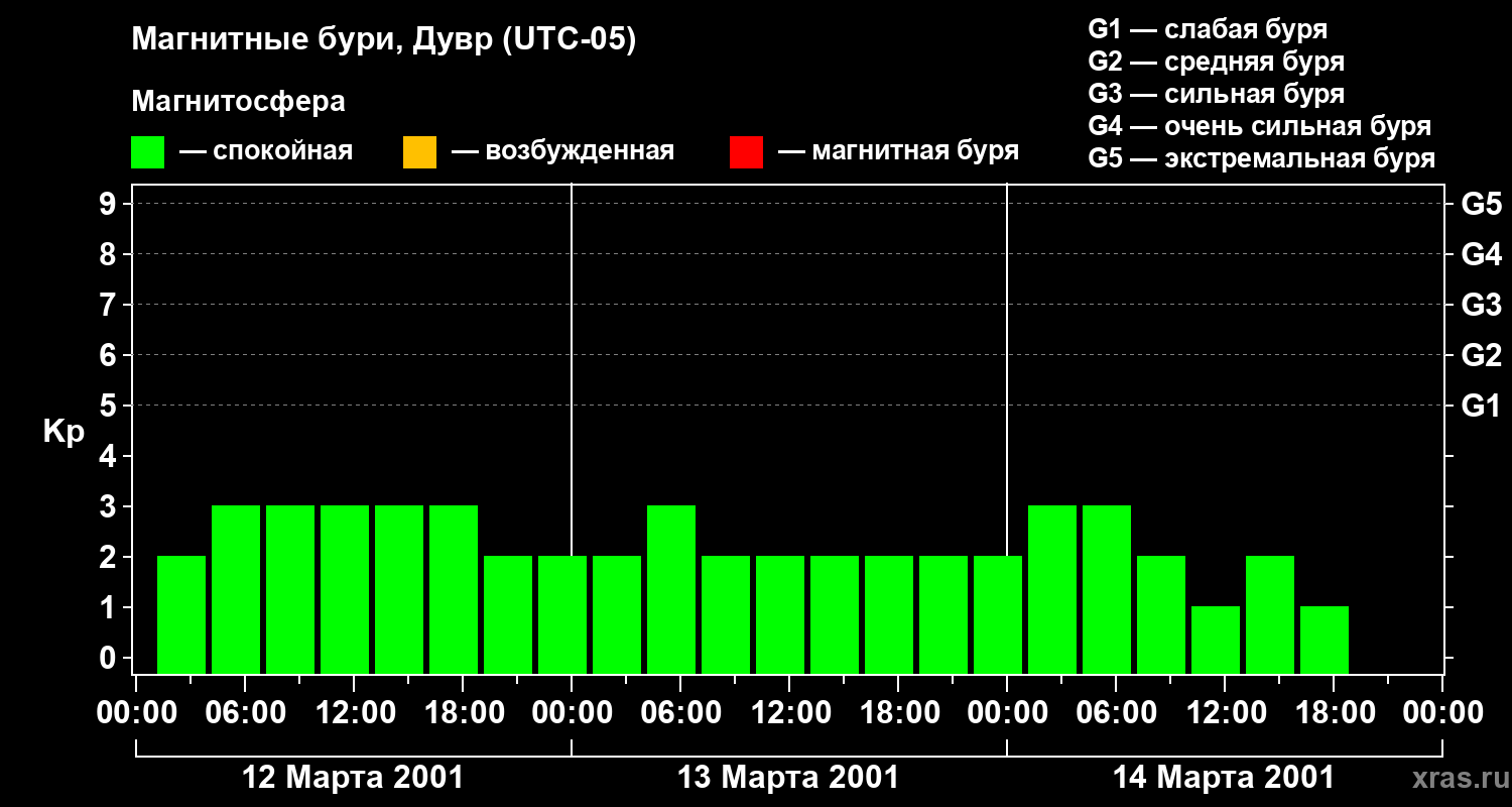 Изменения геомагнитного индекса Kp с 12 по 14 марта 2001 года для средних широт
