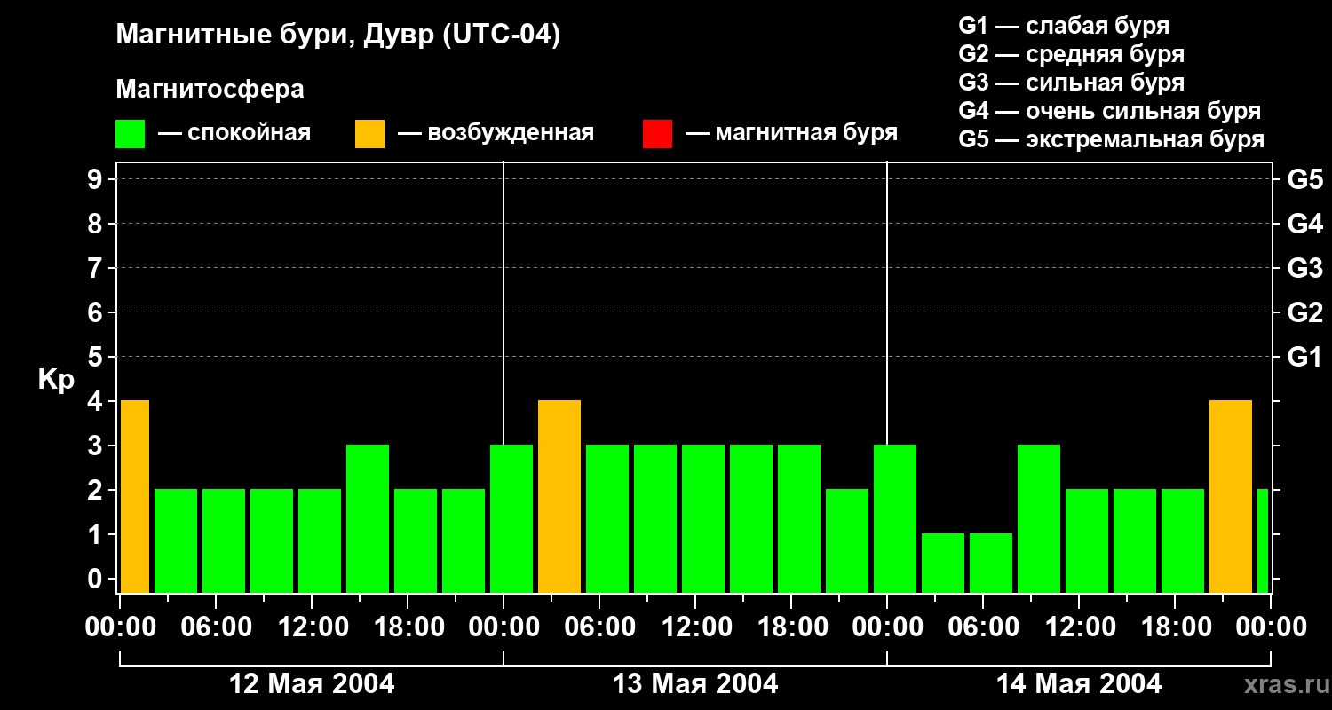 Изменения геомагнитного индекса Kp с 12 по 14 мая 2004 года для средних широт