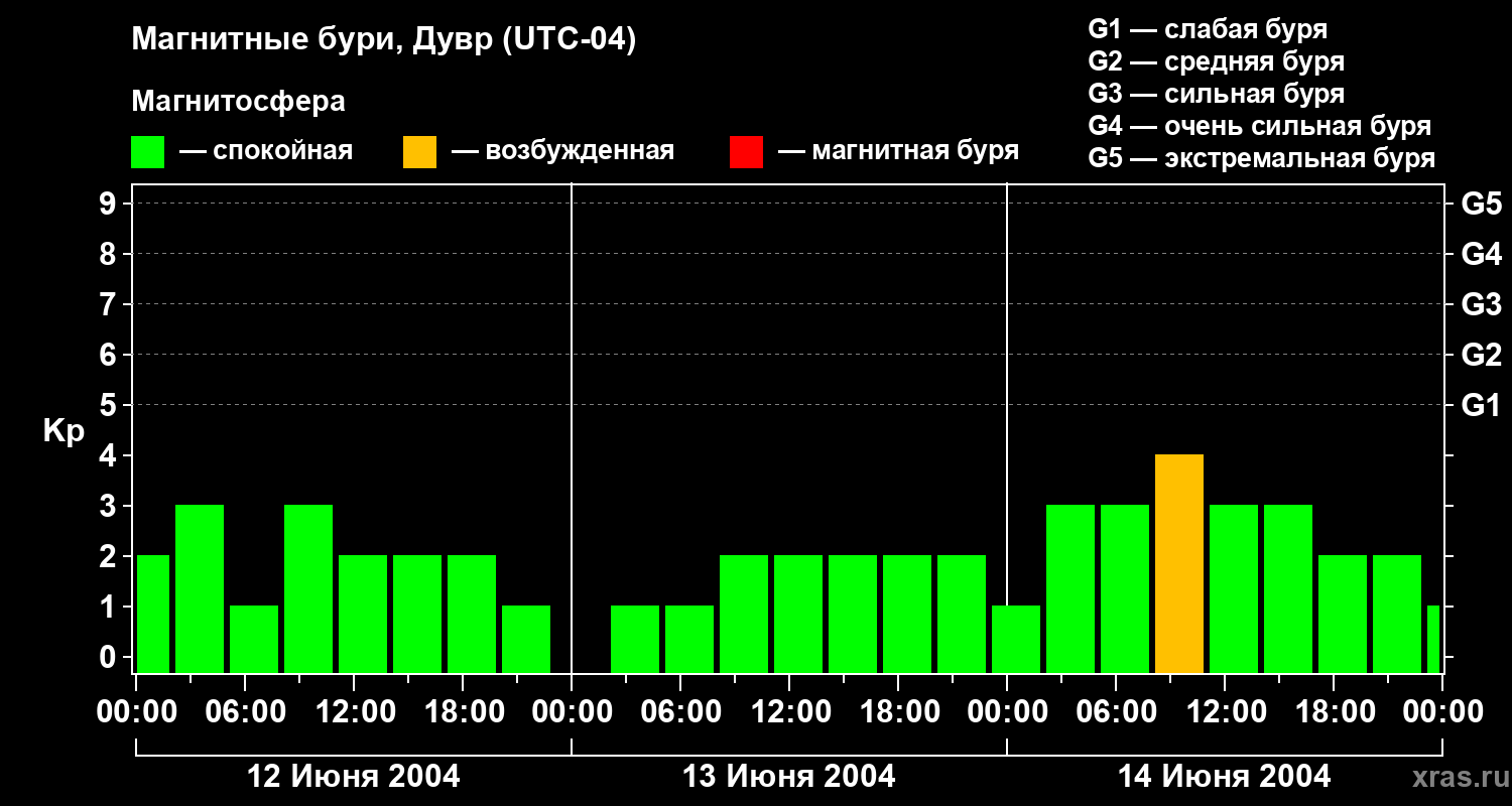 Изменения геомагнитного индекса Kp с 12 по 14 июня 2004 года для средних широт