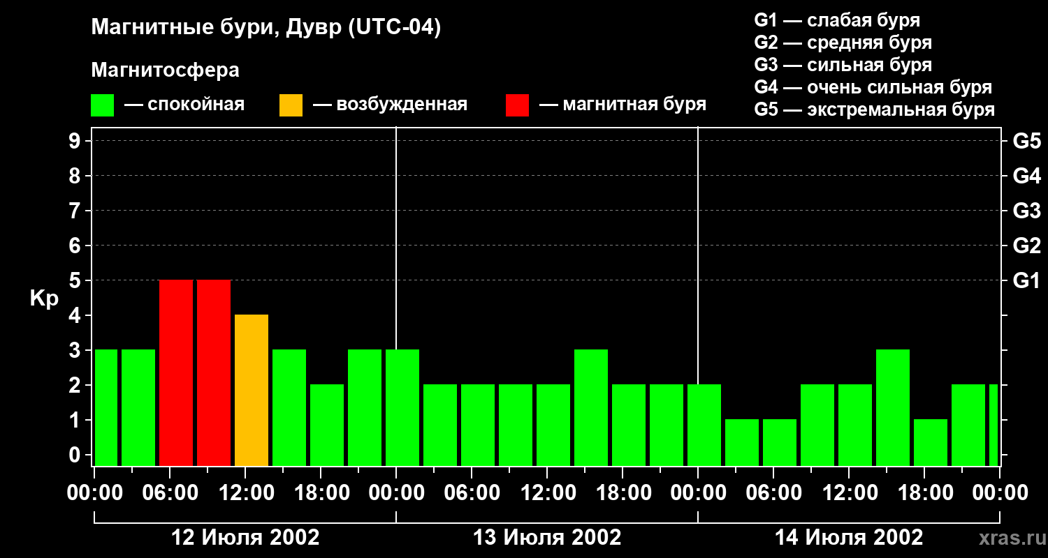 Изменения геомагнитного индекса Kp с 12 по 14 июля 2002 года для средних широт