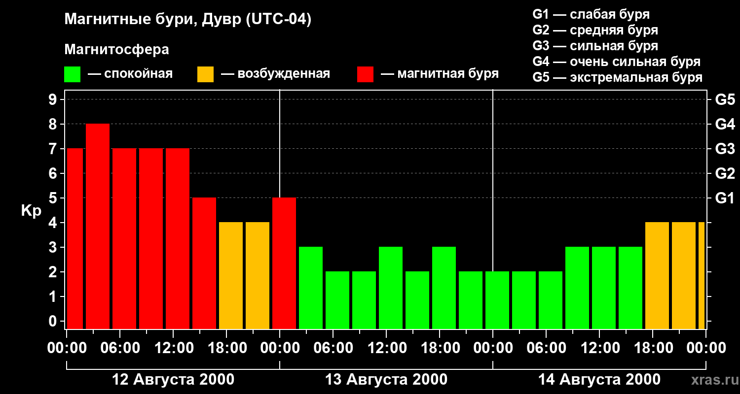 Изменения геомагнитного индекса Kp с 12 по 14 августа 2000 года для средних широт