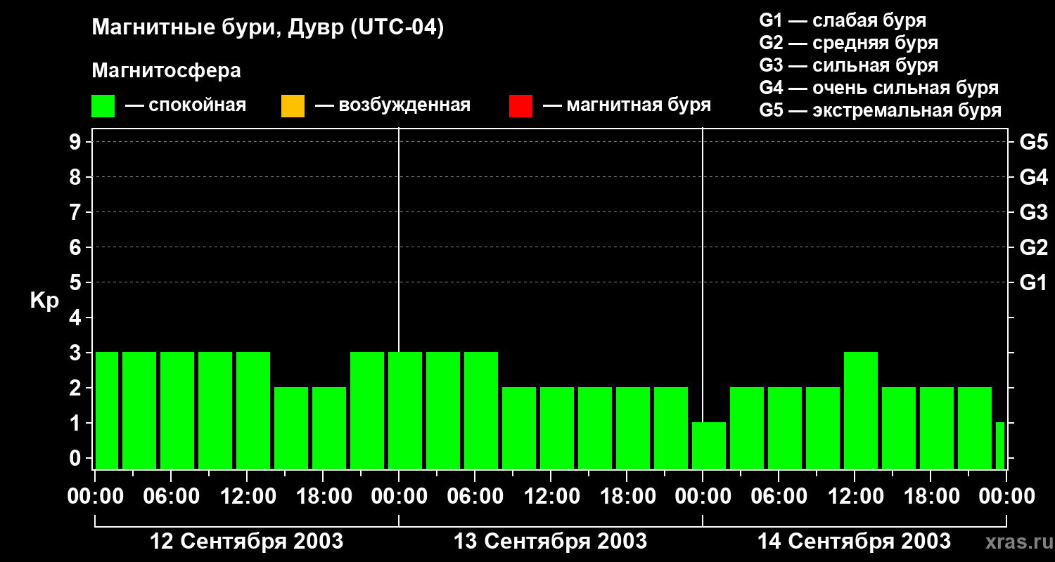 Изменения геомагнитного индекса Kp с 12 по 14 сентября 2003 года для средних широт