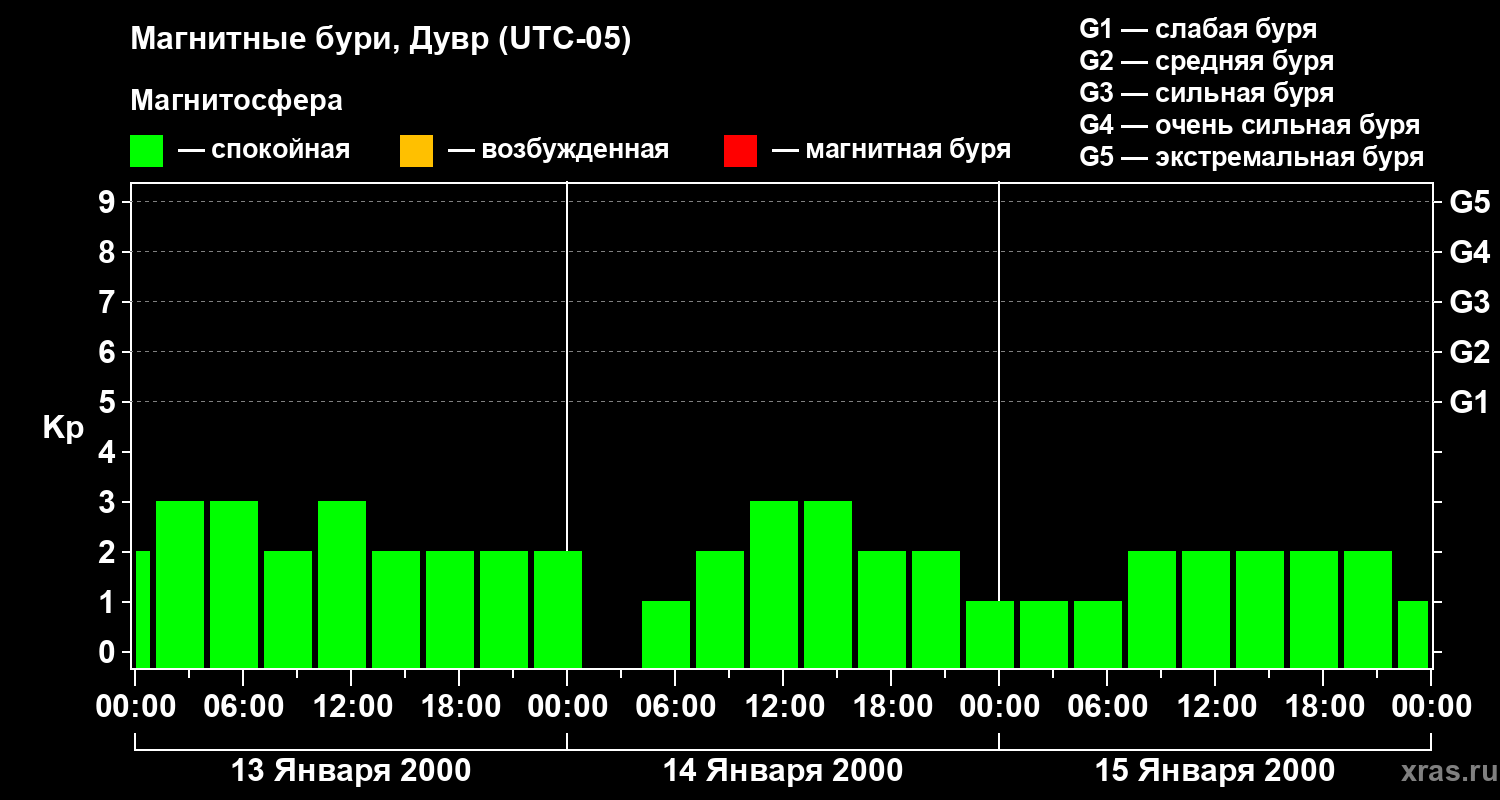 Изменения геомагнитного индекса Kp с 13 по 15 января 2000 года для средних широт