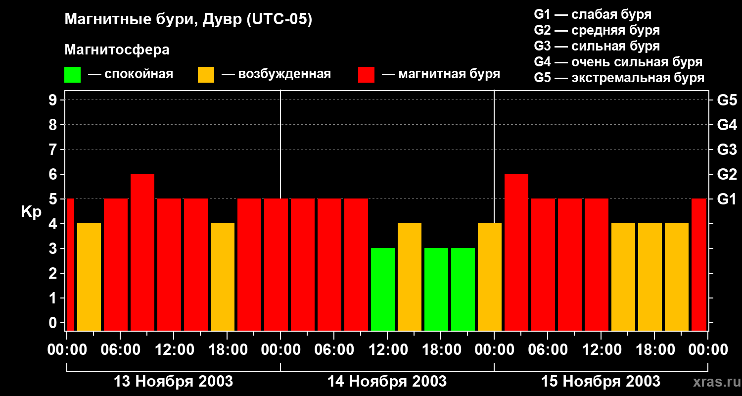 Изменения геомагнитного индекса Kp с 13 по 15 ноября 2003 года для средних широт