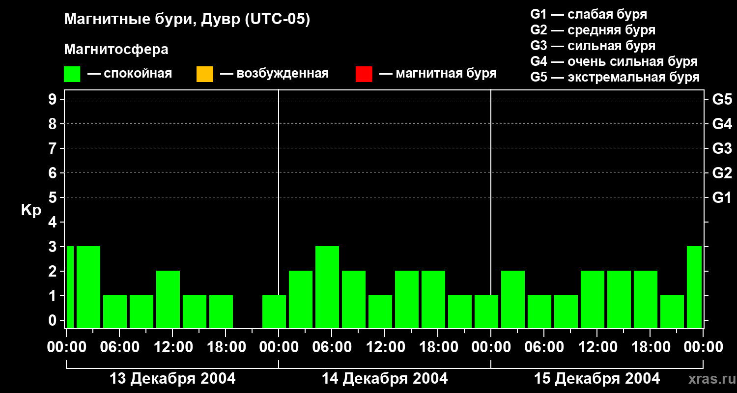 Изменения геомагнитного индекса Kp с 13 по 15 декабря 2004 года для средних широт