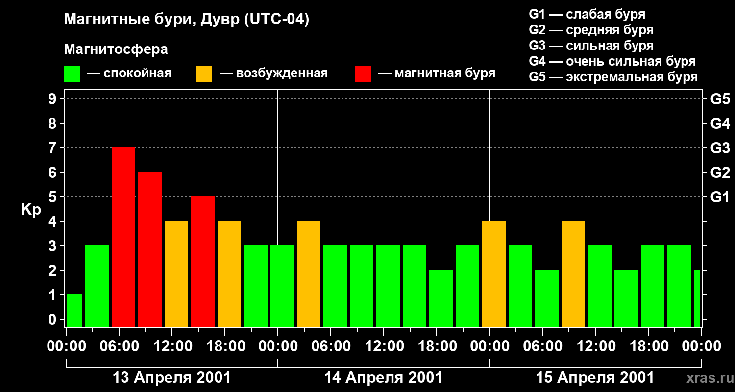 Изменения геомагнитного индекса Kp с 13 по 15 апреля 2001 года для средних широт