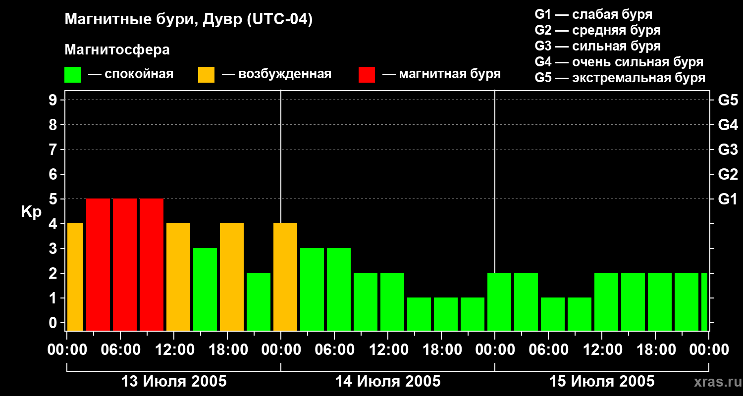 Изменения геомагнитного индекса Kp с 13 по 15 июля 2005 года для средних широт