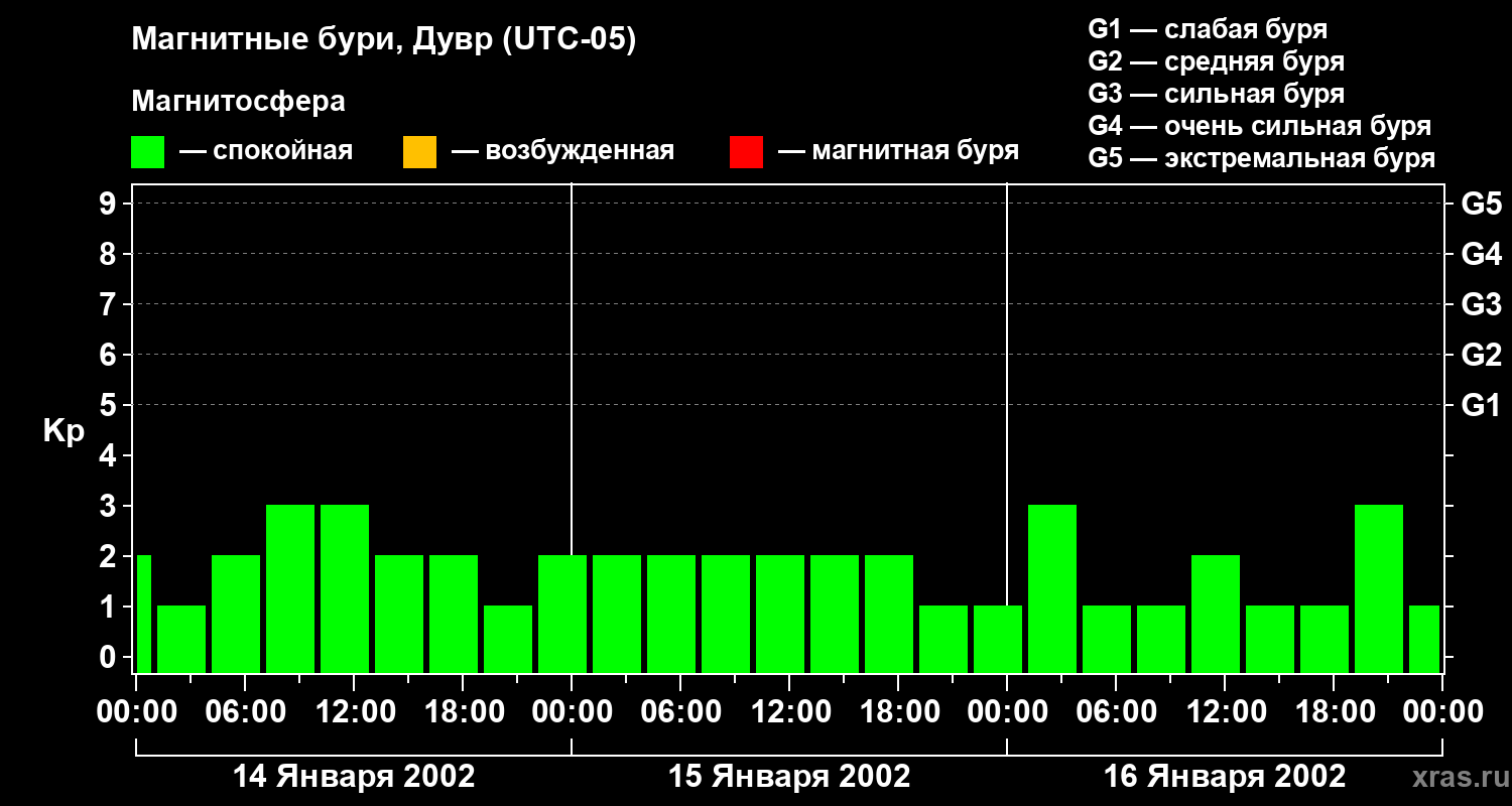 Изменения геомагнитного индекса Kp с 14 по 16 января 2002 года для средних широт