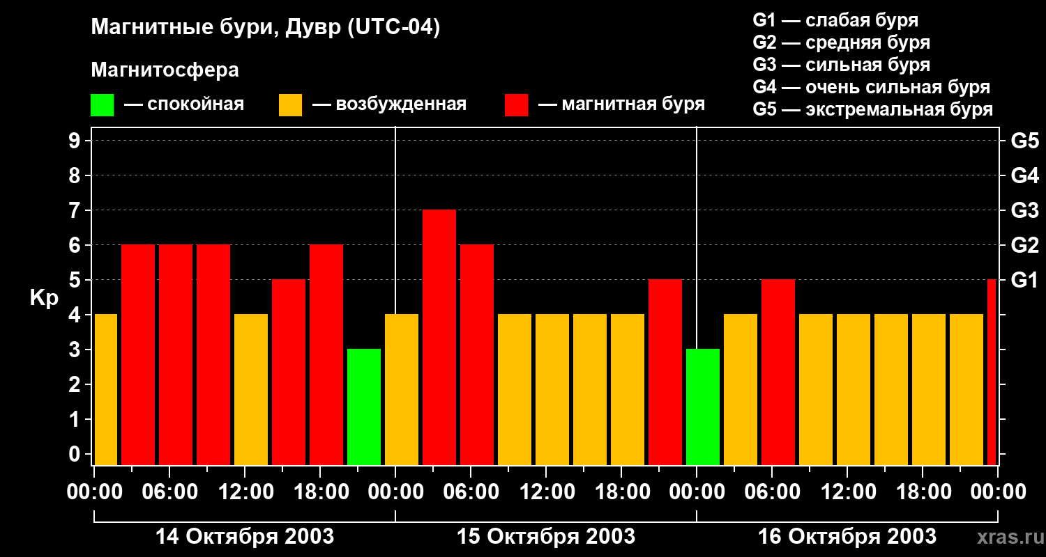 Изменения геомагнитного индекса Kp с 14 по 16 октября 2003 года для средних широт