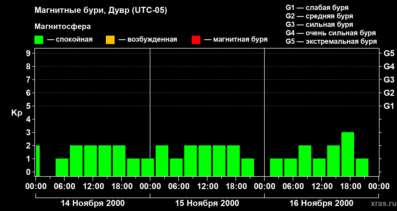 Изменения геомагнитного индекса Kp с 14 по 16 ноября 2000 года для средних широт