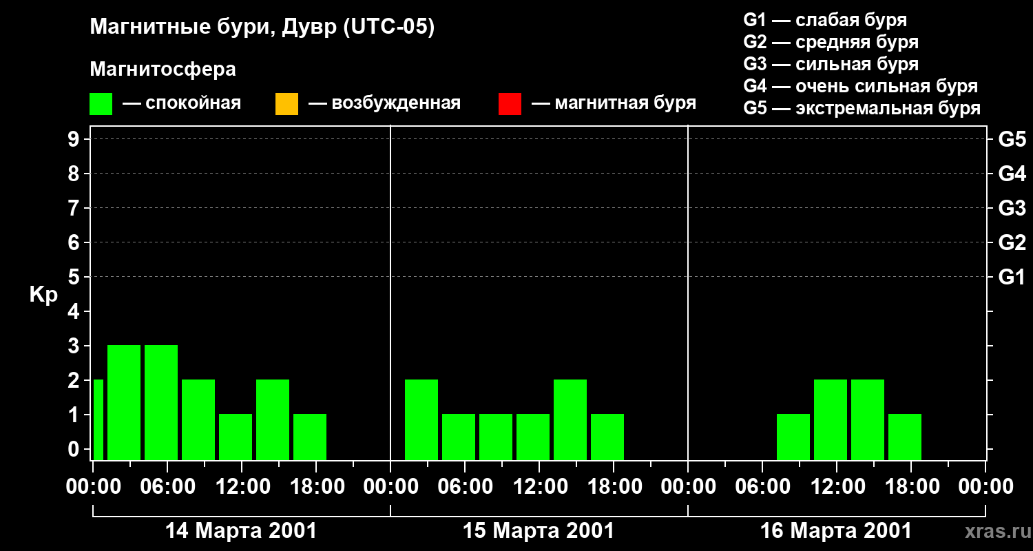 Изменения геомагнитного индекса Kp с 14 по 16 марта 2001 года для средних широт