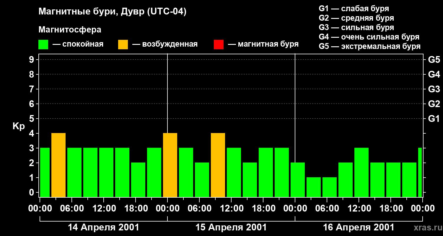 Изменения геомагнитного индекса Kp с 14 по 16 апреля 2001 года для средних широт