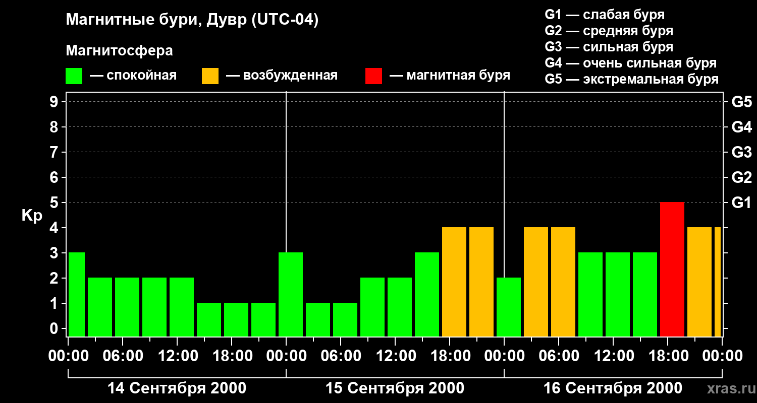 Изменения геомагнитного индекса Kp с 14 по 16 сентября 2000 года для средних широт