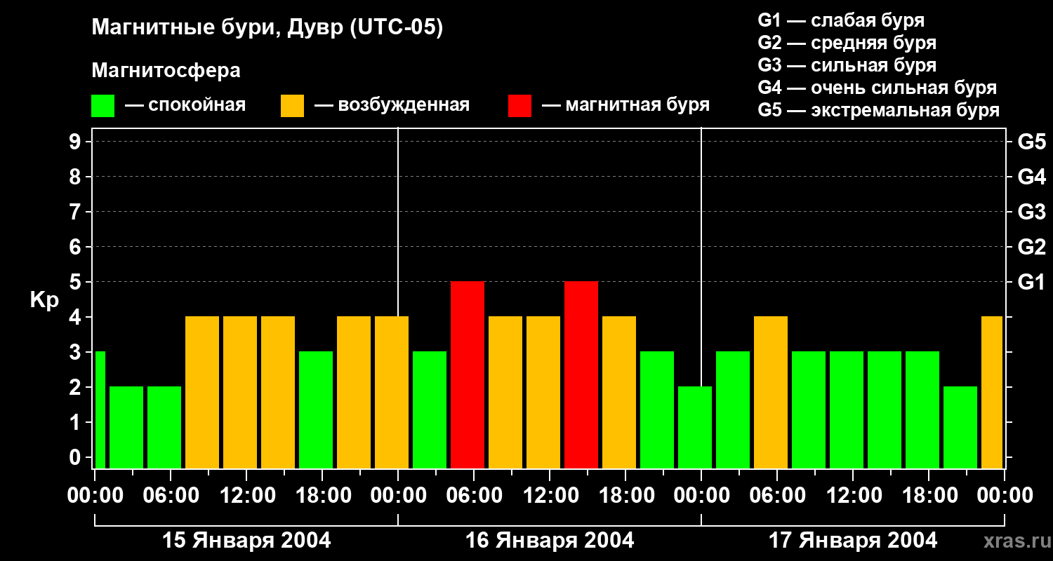 Изменения геомагнитного индекса Kp с 15 по 17 января 2004 года для средних широт