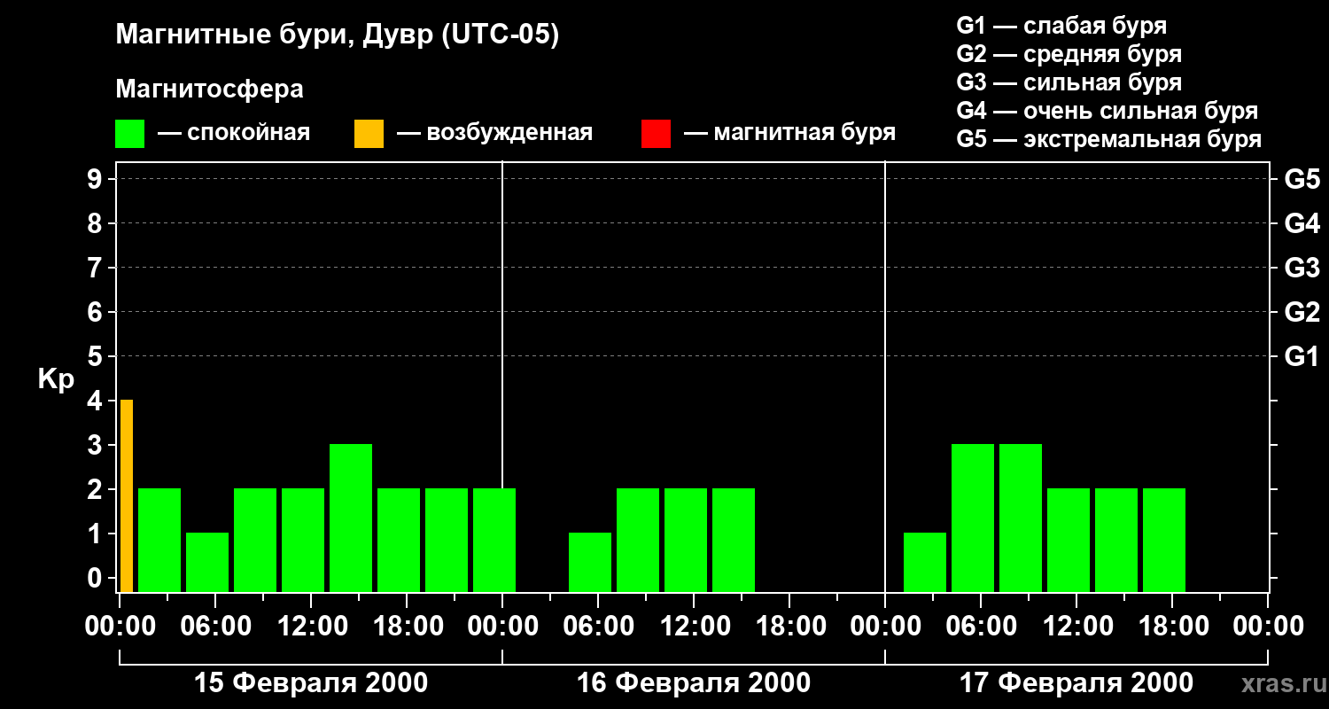 Изменения геомагнитного индекса Kp с 15 по 17 февраля 2000 года для средних широт