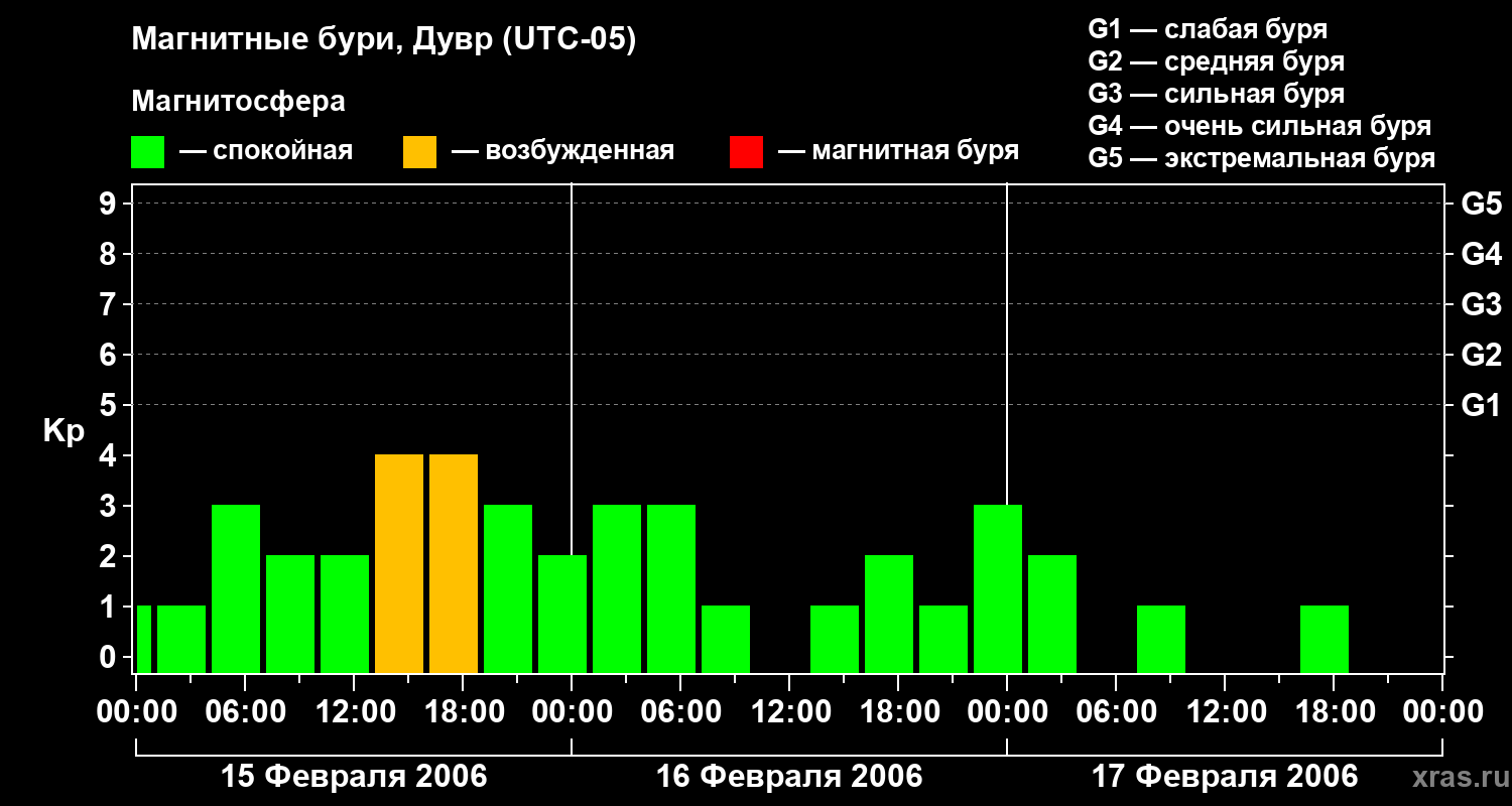 Изменения геомагнитного индекса Kp с 15 по 17 февраля 2006 года для средних широт