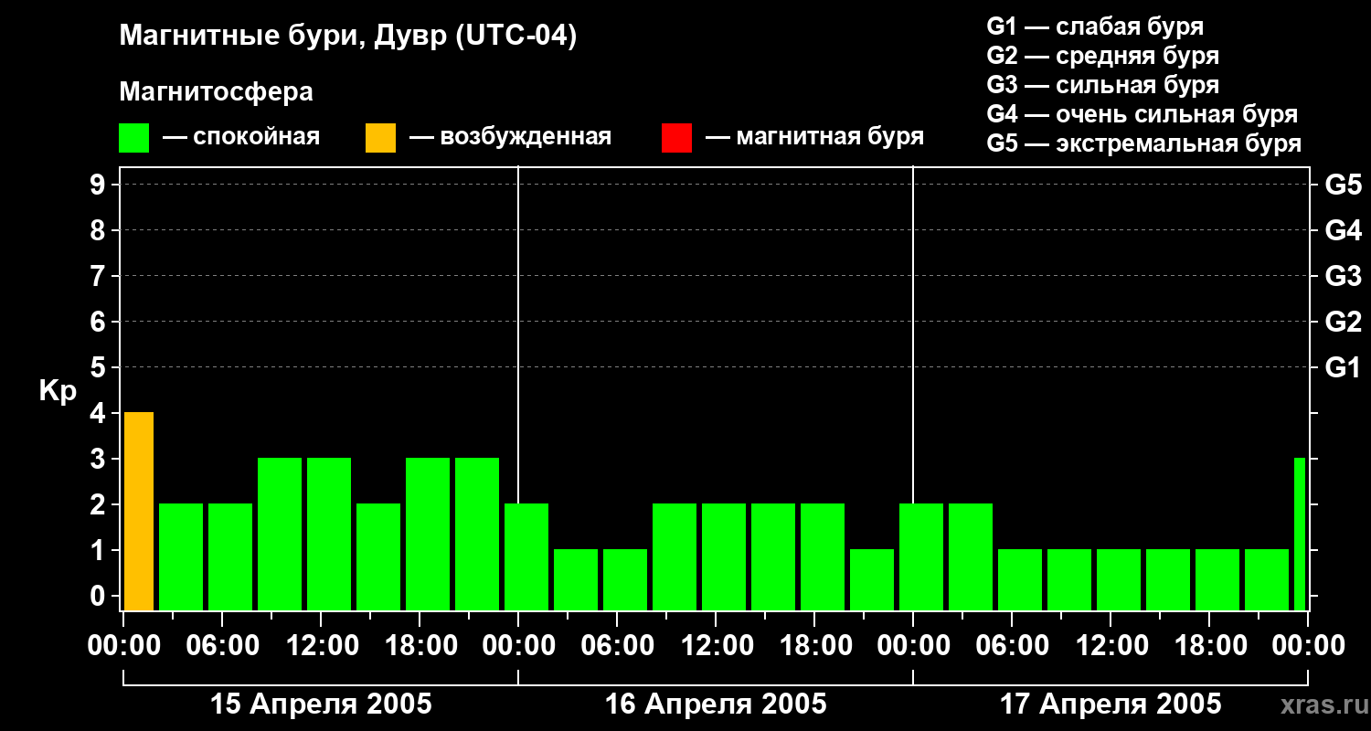 Изменения геомагнитного индекса Kp с 15 по 17 апреля 2005 года для средних широт