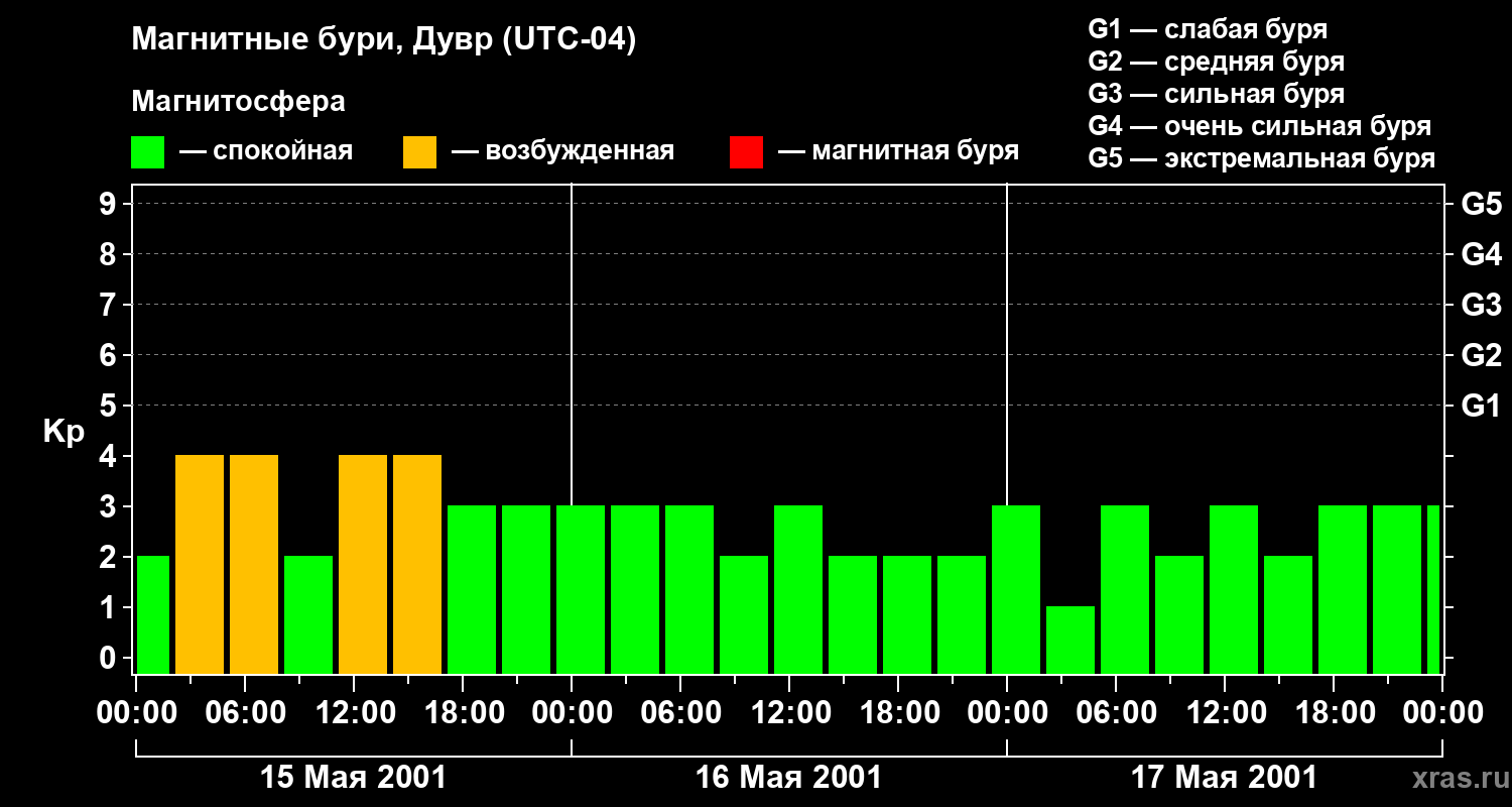 Изменения геомагнитного индекса Kp с 15 по 17 мая 2001 года для средних широт