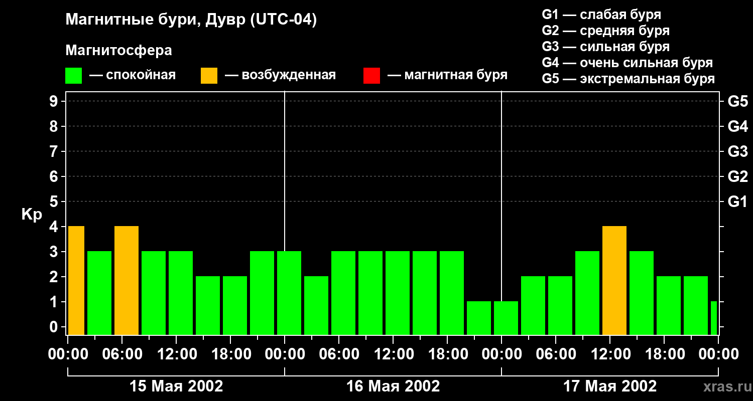Изменения геомагнитного индекса Kp с 15 по 17 мая 2002 года для средних широт