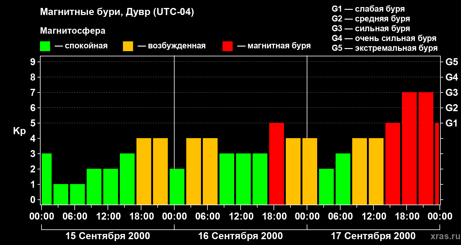 Изменения геомагнитного индекса Kp с 15 по 17 сентября 2000 года для средних широт