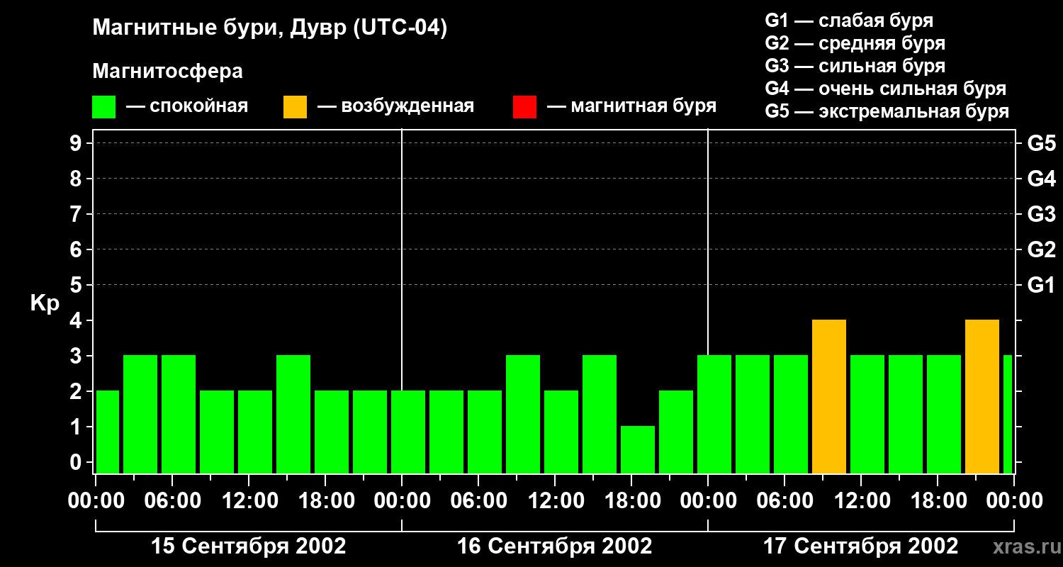 Изменения геомагнитного индекса Kp с 15 по 17 сентября 2002 года для средних широт