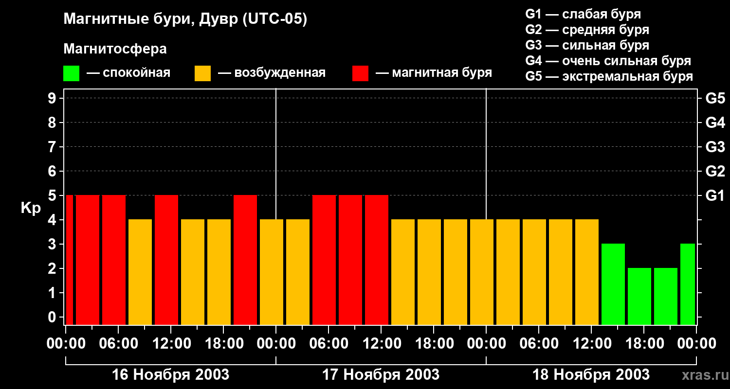 Изменения геомагнитного индекса Kp с 16 по 18 ноября 2003 года для средних широт