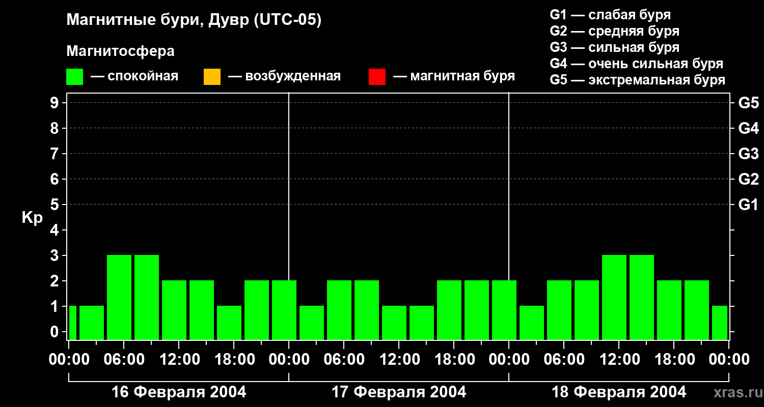Изменения геомагнитного индекса Kp с 16 по 18 февраля 2004 года для средних широт