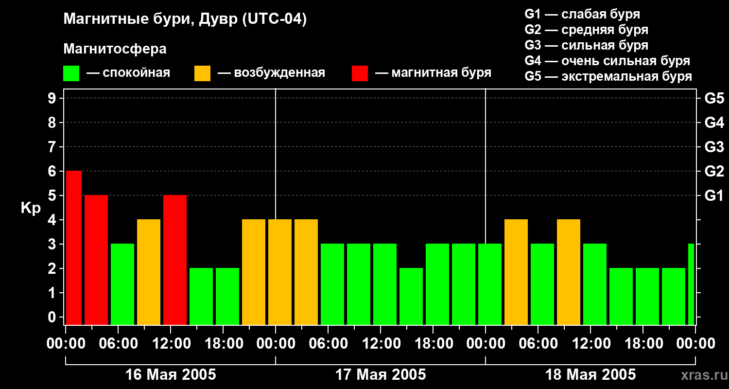Изменения геомагнитного индекса Kp с 16 по 18 мая 2005 года для средних широт