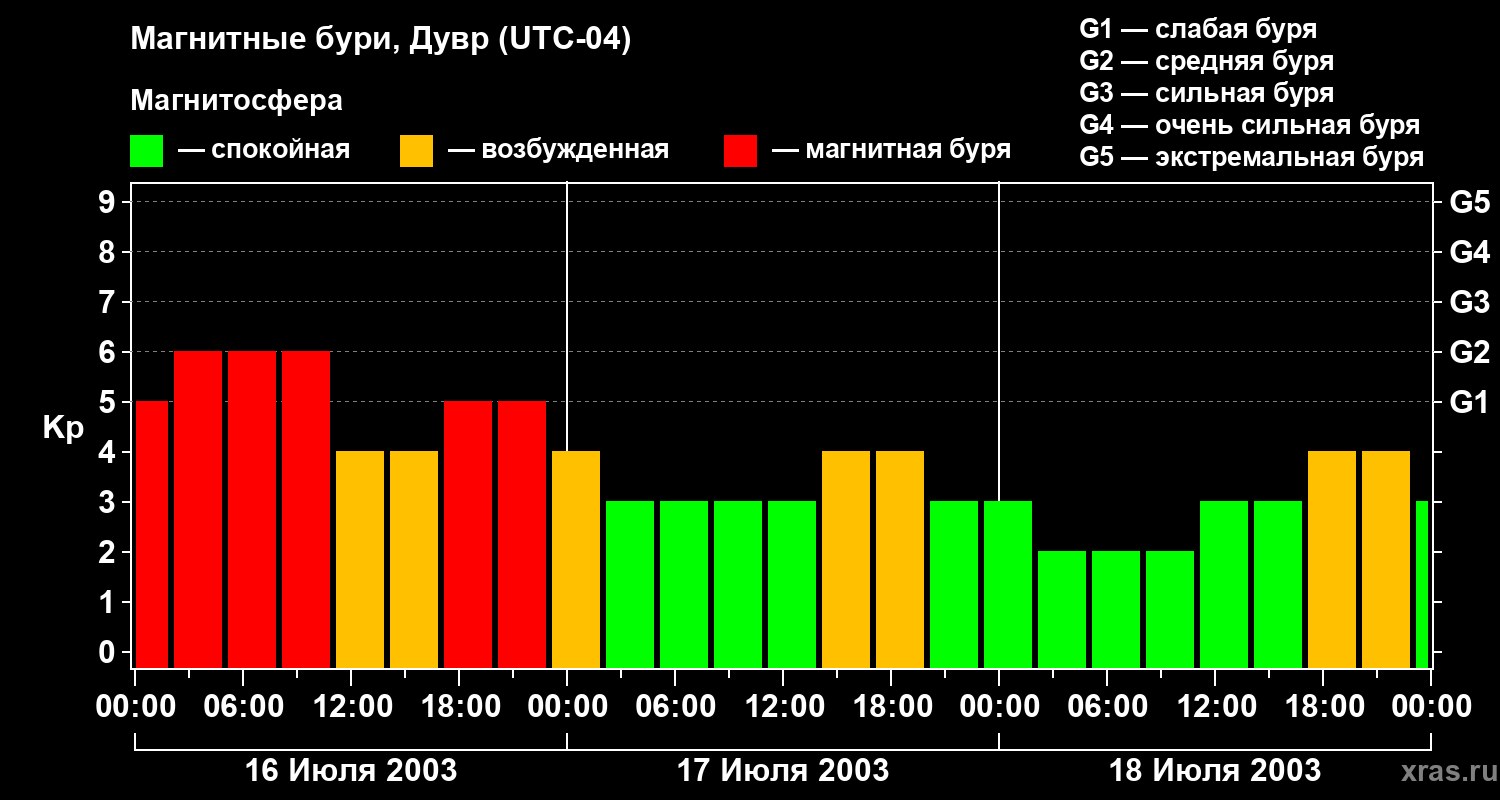 Изменения геомагнитного индекса Kp с 16 по 18 июля 2003 года для средних широт