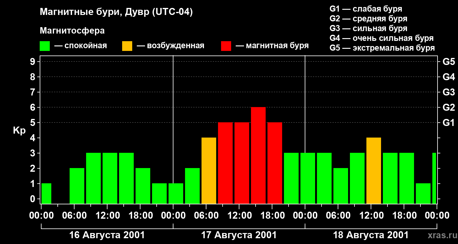 Изменения геомагнитного индекса Kp с 16 по 18 августа 2001 года для средних широт