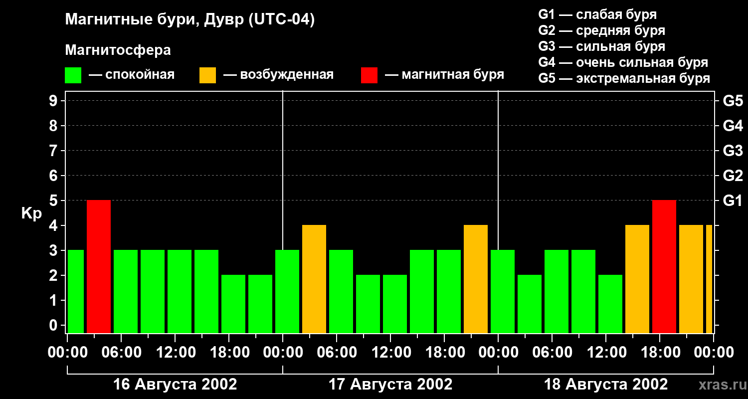 Изменения геомагнитного индекса Kp с 16 по 18 августа 2002 года для средних широт