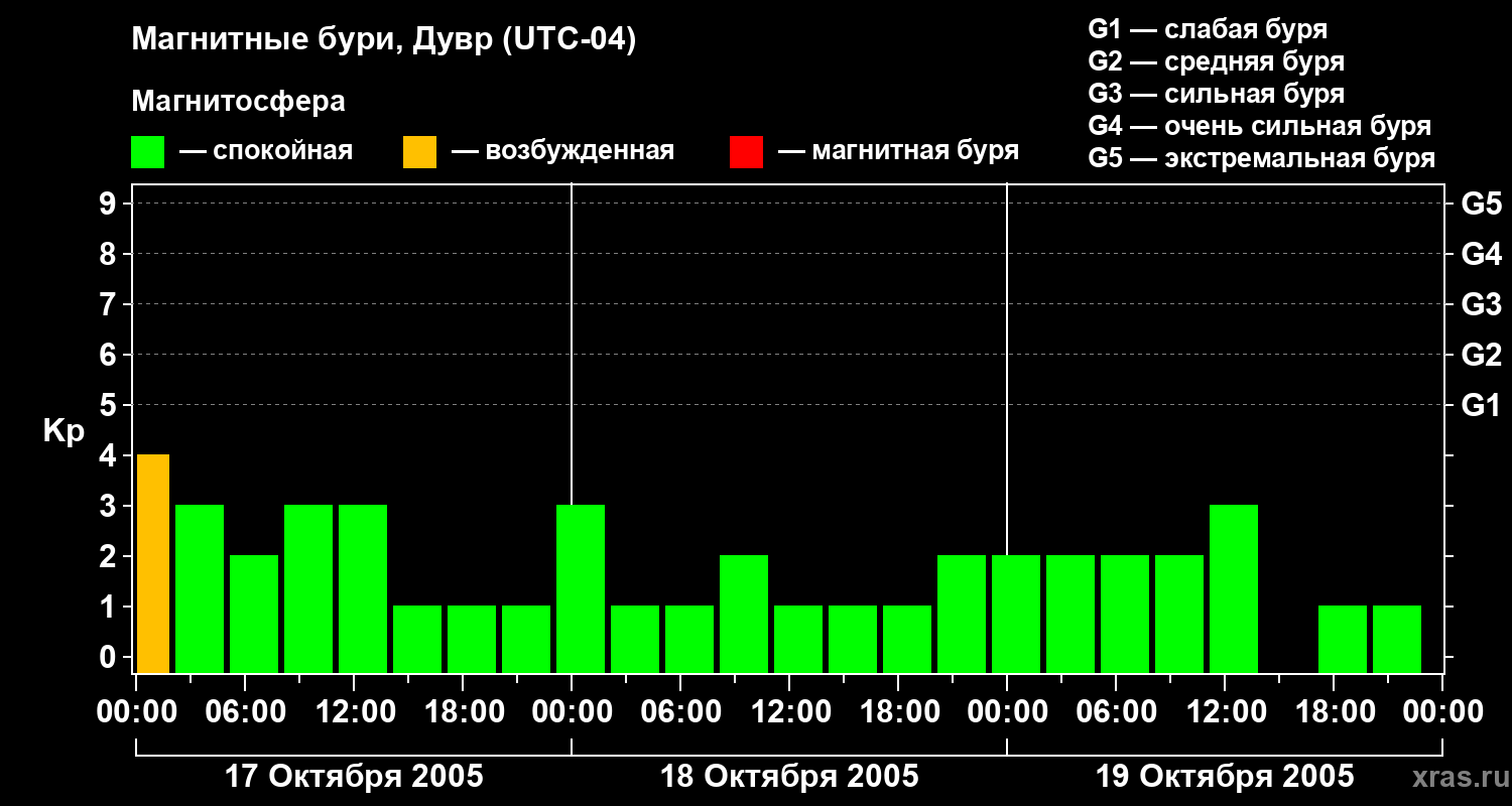 Изменения геомагнитного индекса Kp с 17 по 19 октября 2005 года для средних широт