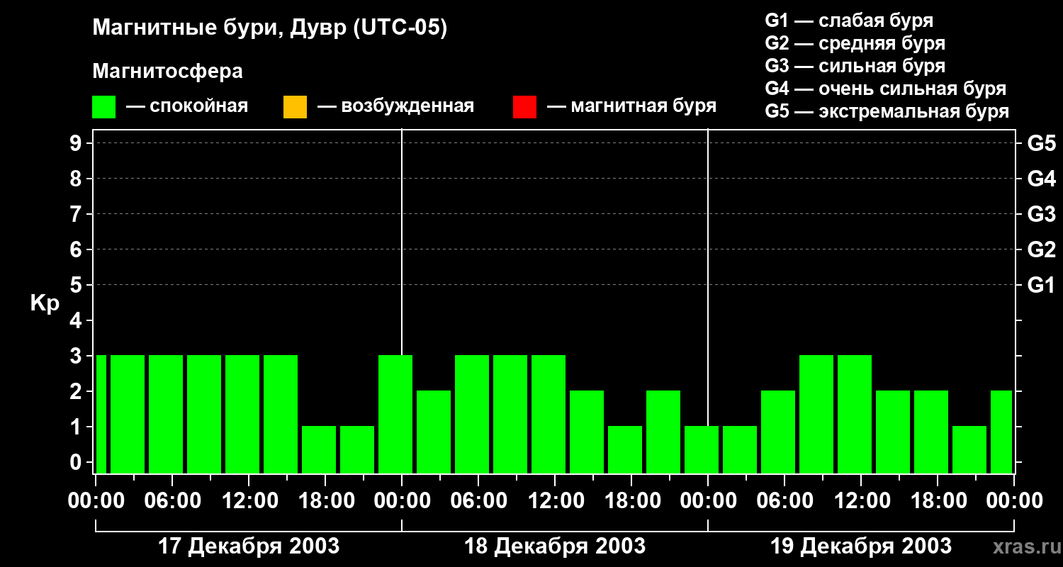 Изменения геомагнитного индекса Kp с 17 по 19 декабря 2003 года для средних широт