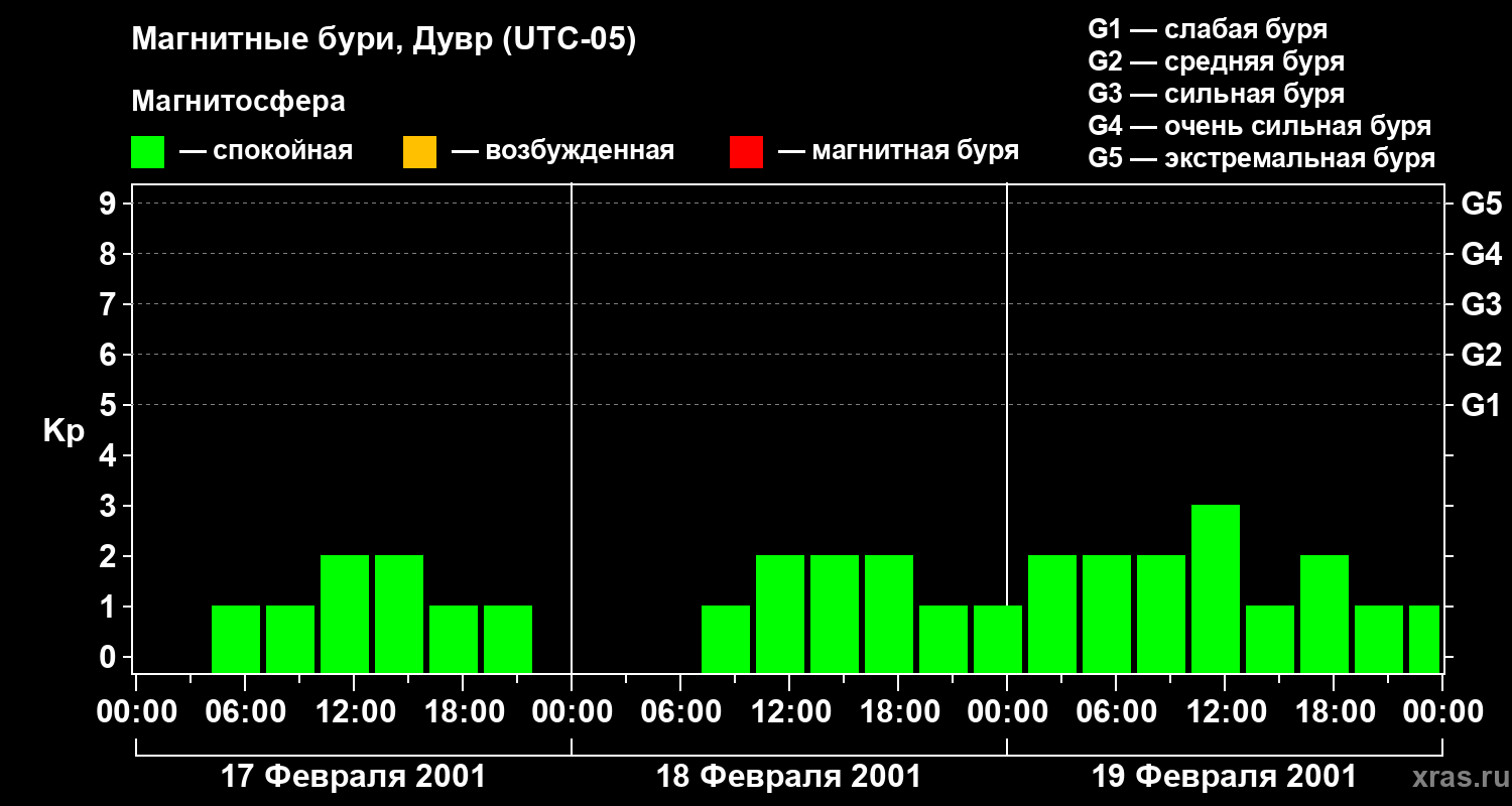 Изменения геомагнитного индекса Kp с 17 по 19 февраля 2001 года для средних широт