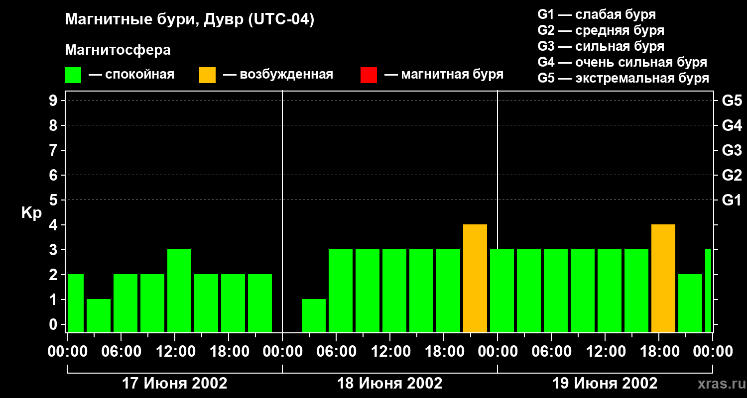 Изменения геомагнитного индекса Kp с 17 по 19 июня 2002 года для средних широт