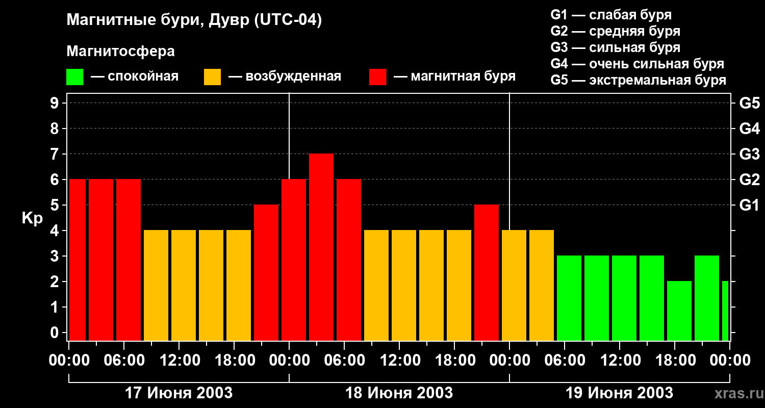 Изменения геомагнитного индекса Kp с 17 по 19 июня 2003 года для средних широт