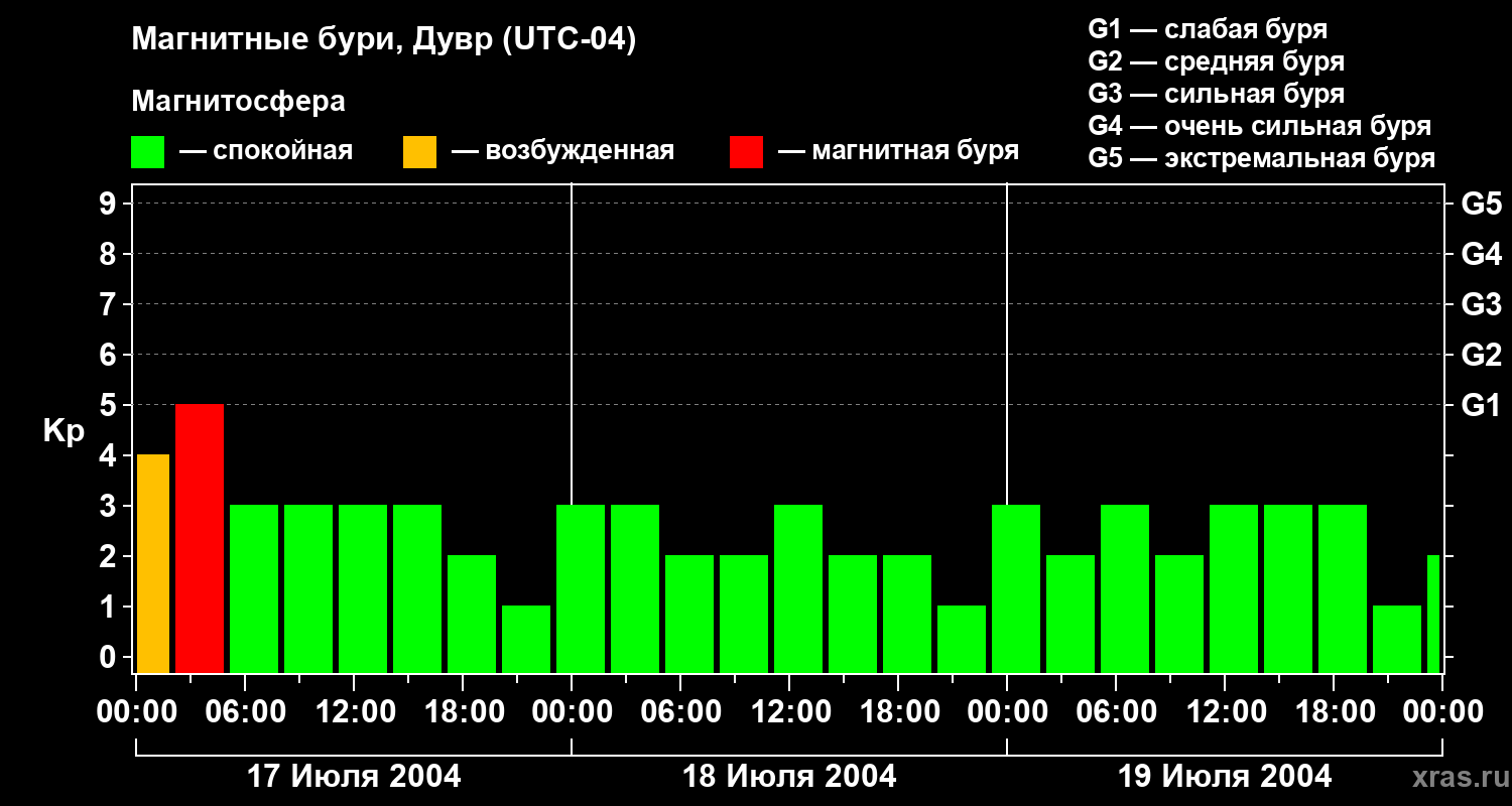 Изменения геомагнитного индекса Kp с 17 по 19 июля 2004 года для средних широт