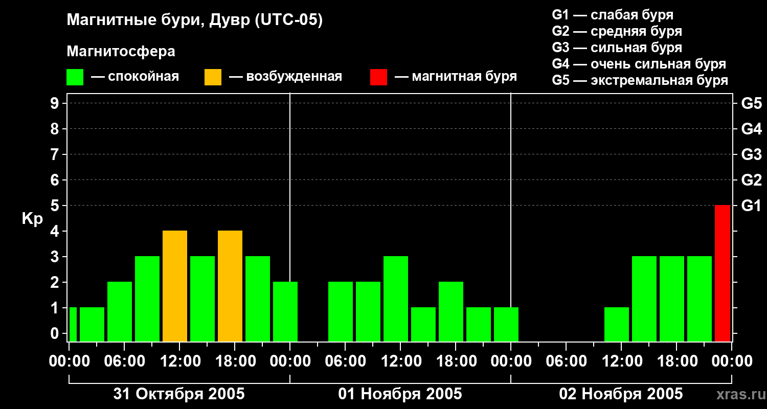 Изменения геомагнитного индекса Kp с 31 октября по 2 ноября 2005 года для средних широт