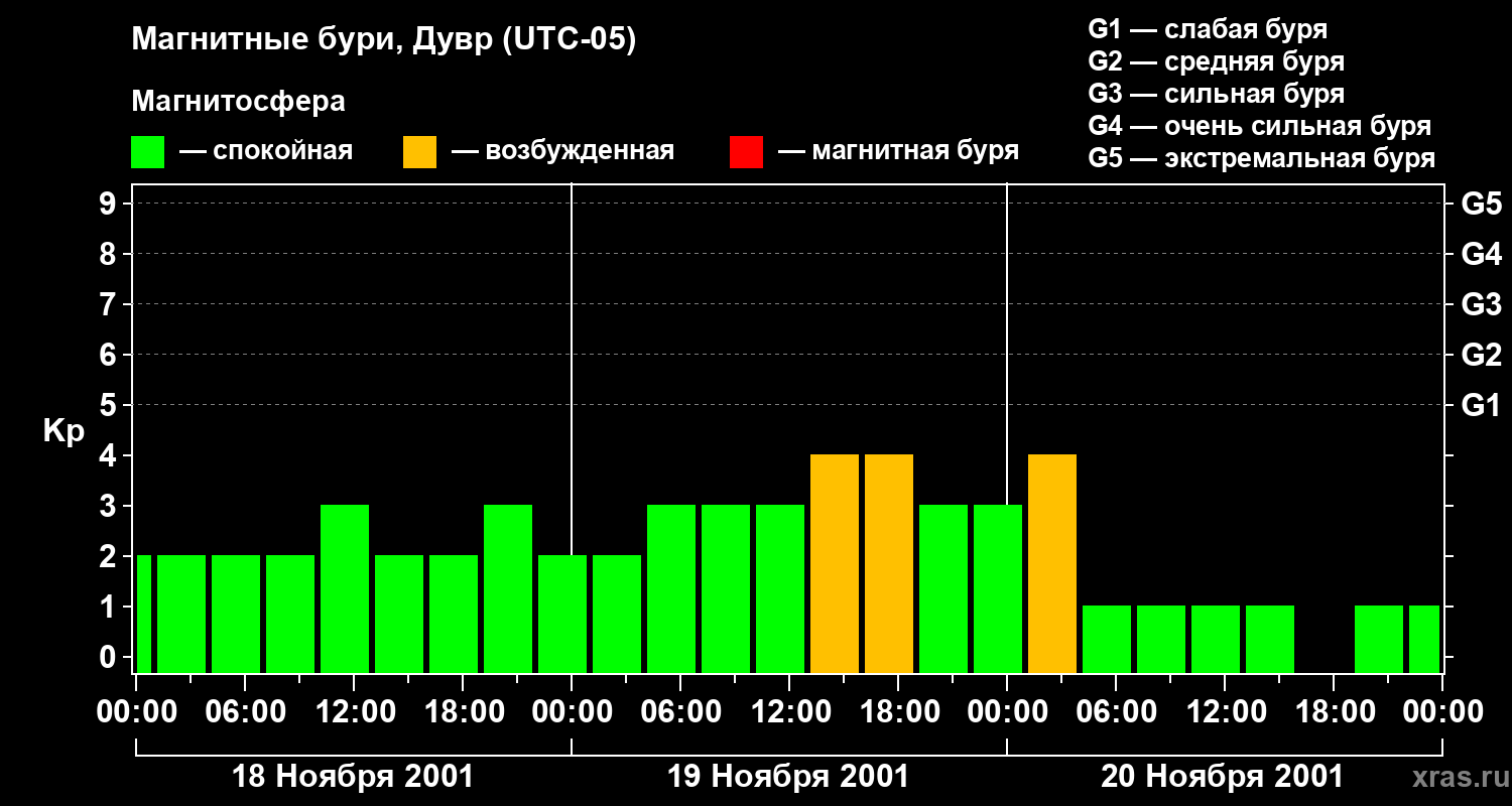 Изменения геомагнитного индекса Kp с 18 по 20 ноября 2001 года для средних широт