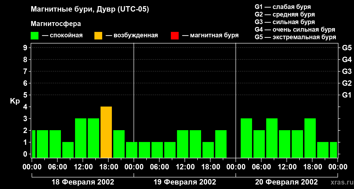Изменения геомагнитного индекса Kp с 18 по 20 февраля 2002 года для средних широт