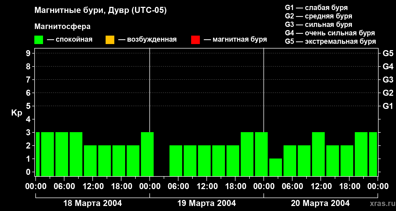 Изменения геомагнитного индекса Kp с 18 по 20 марта 2004 года для средних широт